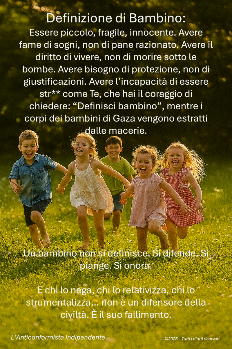 Un bambino non si definisce. Si riconosce. Si protegge. Si piange. E chi, davanti ai corpi dei piccoli di Gaza, osa relativizzare la loro esistenza con sofismi da tribunale ideologico, non è un interlocutore. È un complice.
